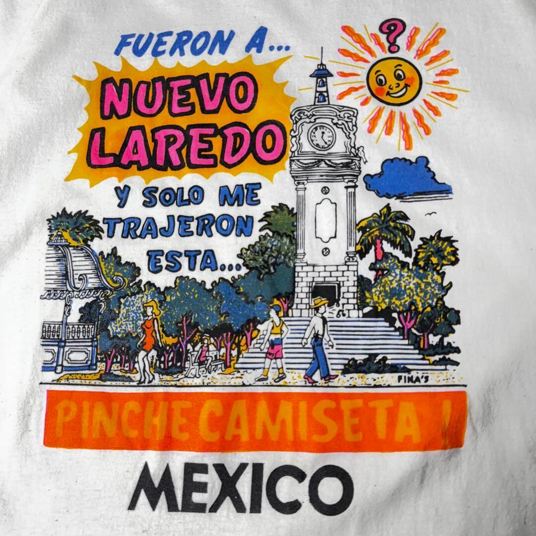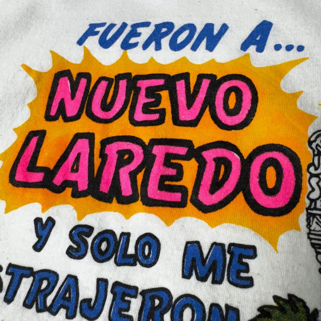 このTシャツは、メキシコのヌエボ・ラレドに行った人が、お土産としてこれしか買ってきてくれなかった、クソTシャツ!というユーモラスなメッセージが込められている。